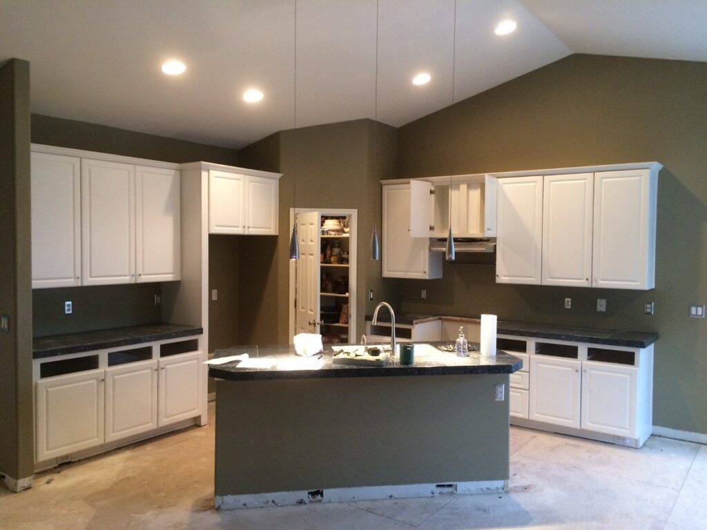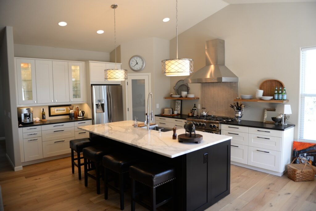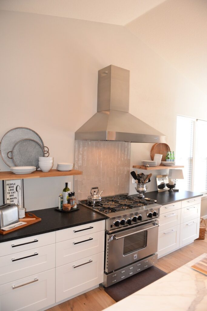 This custom IKEA kitchen remodel features hardwood flooring, solid butcherblock floating shelves, and laminate Shaker Shallow Dendra Doors fronts on an IKEA Sektion cabinet boxes. Veneer Floating Shelves by Dendra Doors.