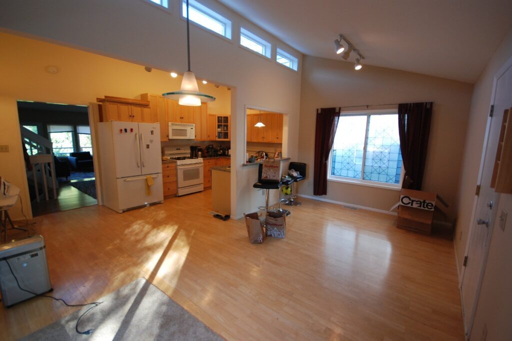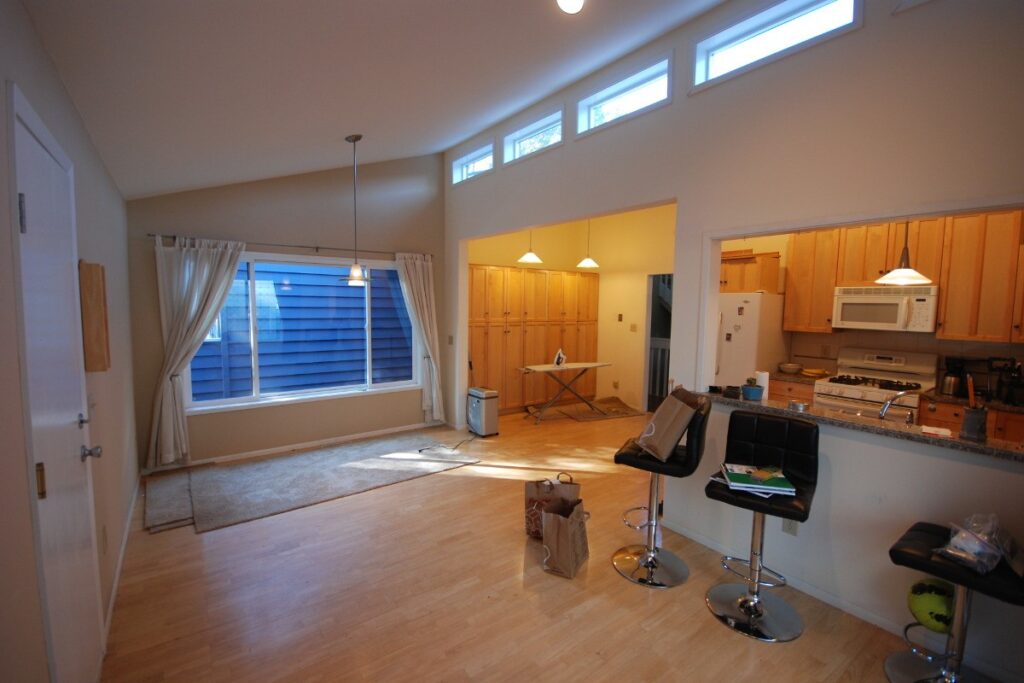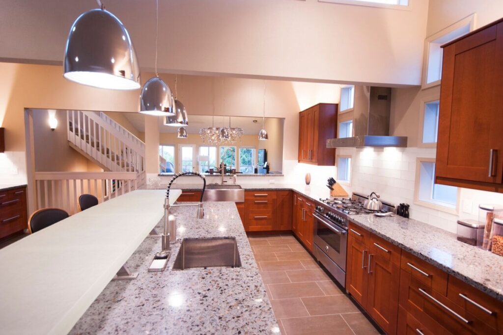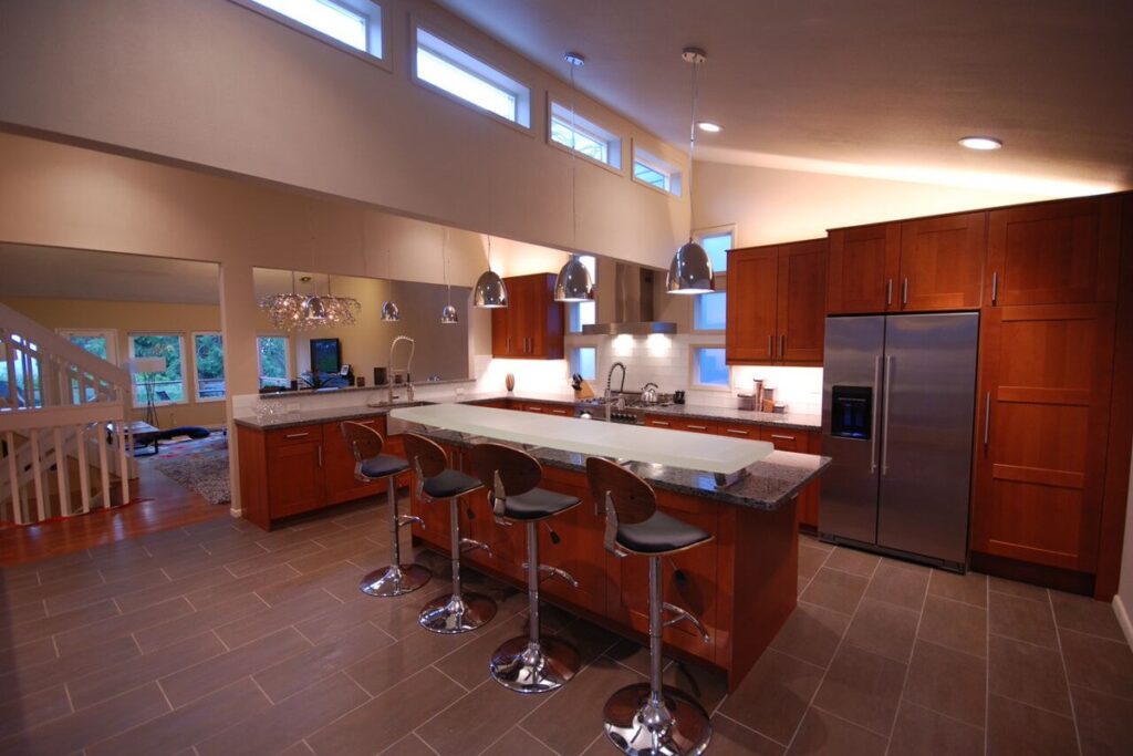 A complete Modern Kitchen Remodel including countertops, seating, lighting, custom IKEA cabinets, and brand new stainless steel appliances.